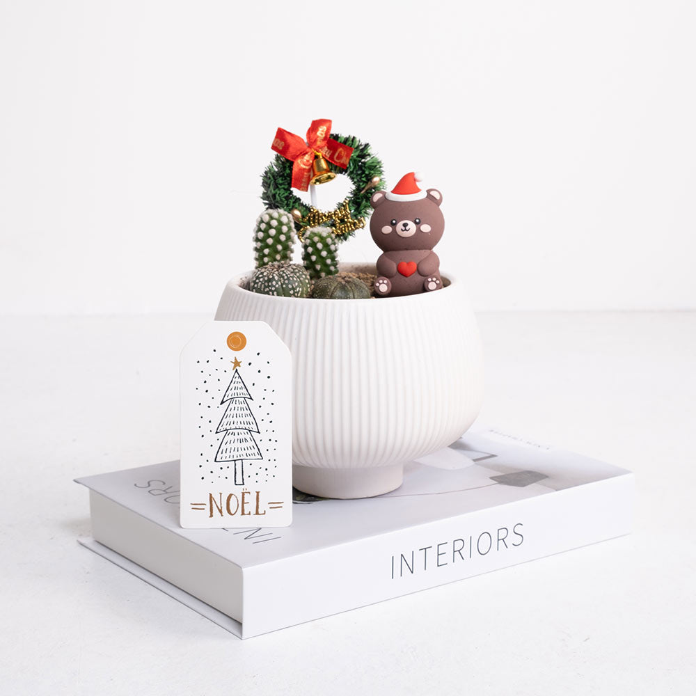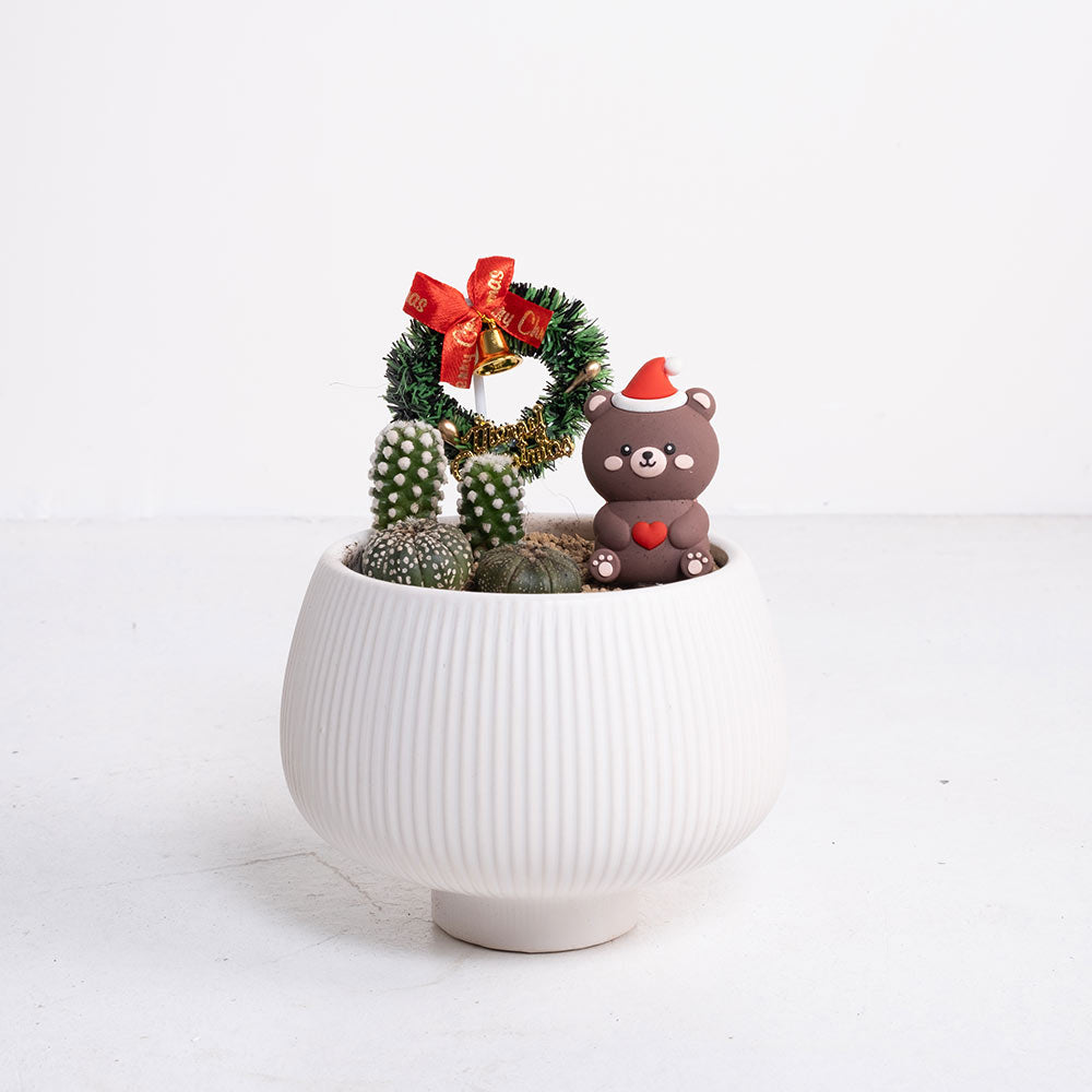 抱著愛心的聖誕小熊坐在其中,彷彿在說:「即使冬天再冷,我也會給你最溫暖的抱抱。」這盆充滿愛與圓滿寓意的植栽,是聖誕節傳遞心意的最佳選擇。