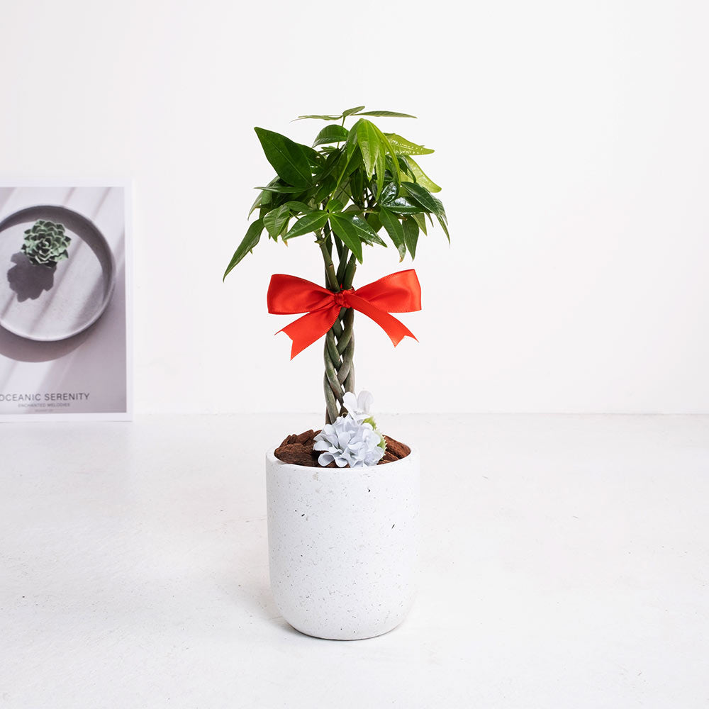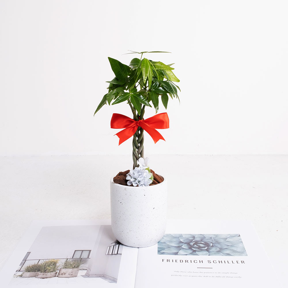 馬拉巴栗 (學名:Pachira macrocarpa),俗稱發財樹,原產於墨西哥、哥斯大黎加等地。它以莖幹基部膨大、掌狀複葉和強韌的生命力而聞名 。這款「繫住好運」的盆栽,特別採用三編或五編髮辮編織型的莖幹造型,再繫上紅色緞帶,寓意著將財富與好運緊緊繫住,是年節、開幕或新居送禮的首選吉祥植物。