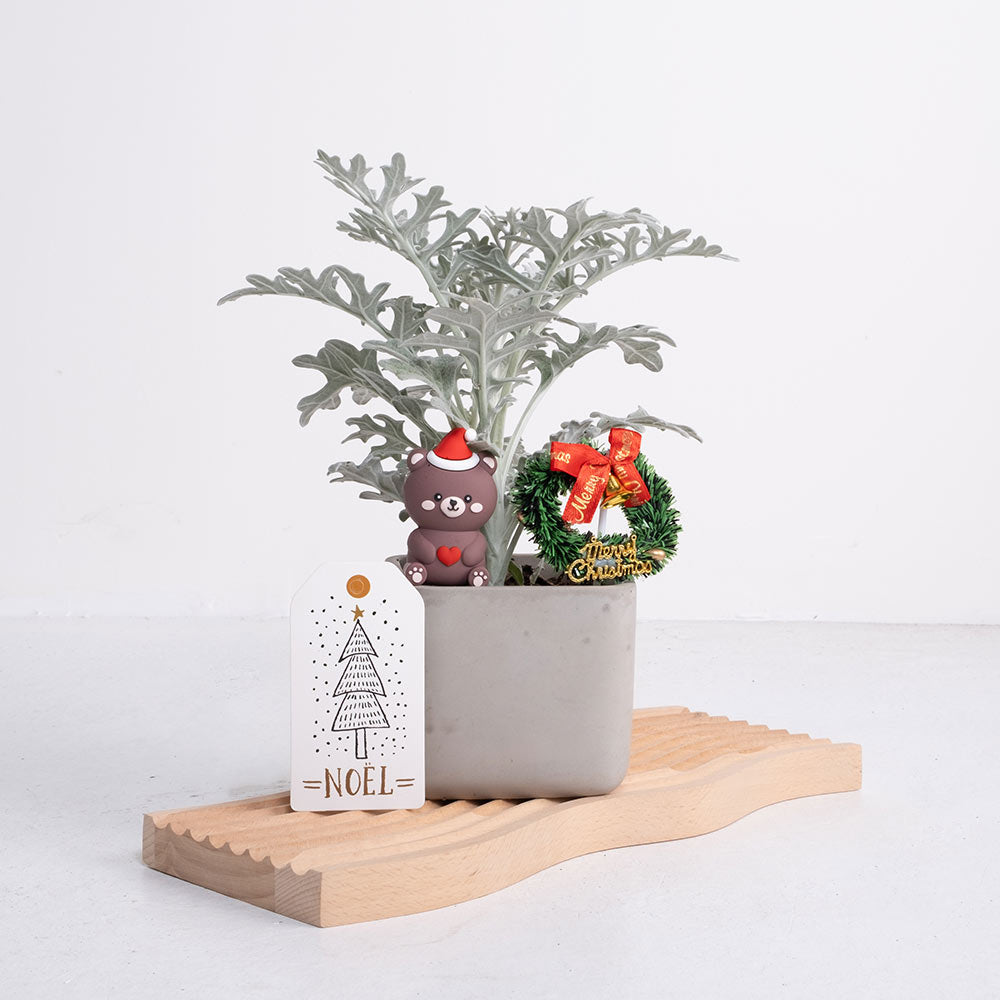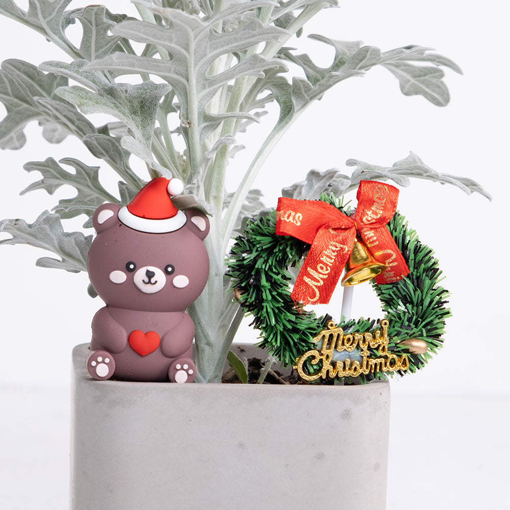 搭配戴著聖誕帽的萌萌小熊與精緻花圈,這不僅是一盆植物,更是一份溫暖的聖誕祝福。適合擺放在辦公桌或窗台,讓這份銀白色的浪漫,陪您度過最溫馨的佳節時光。