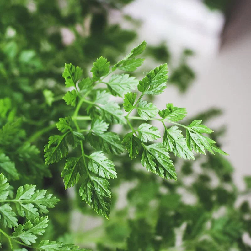 山蘿蔔葉 (Chervil),又稱香葉芹或細葉香芹,其葉子外觀酷似紅蘿蔔頂部,莖部帶有細緻的溝槽,淺綠色的葉片類似扁葉巴西利,但味道更加細緻,帶有淡淡的甘草和茴香味,清新而細膩。它在法國料理中被廣泛使用,是法國菜中不可或缺的香料之一。香葉芹富含類黃酮,有助於身體吸收維生素C。
