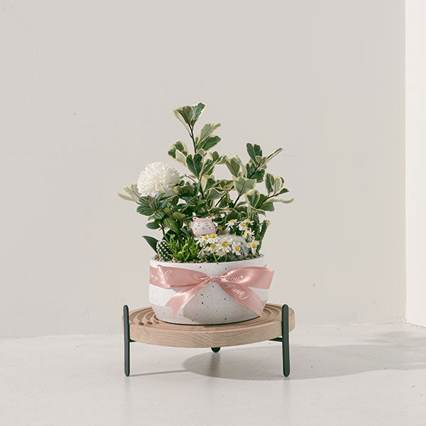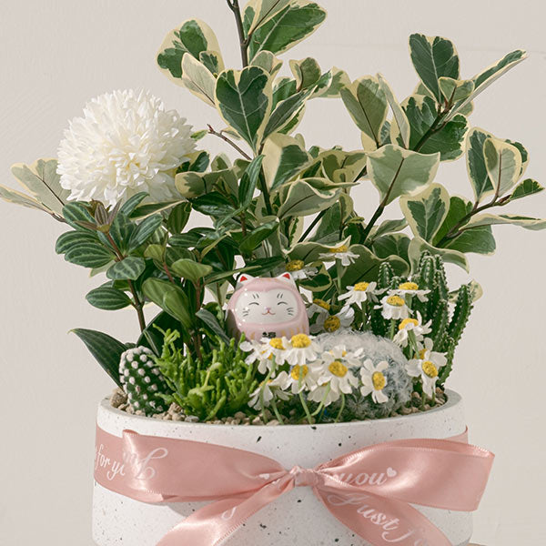 裝飾:粉色招財貓公仔一個、人造洋甘菊與人造白色花卉、緞帶裝飾