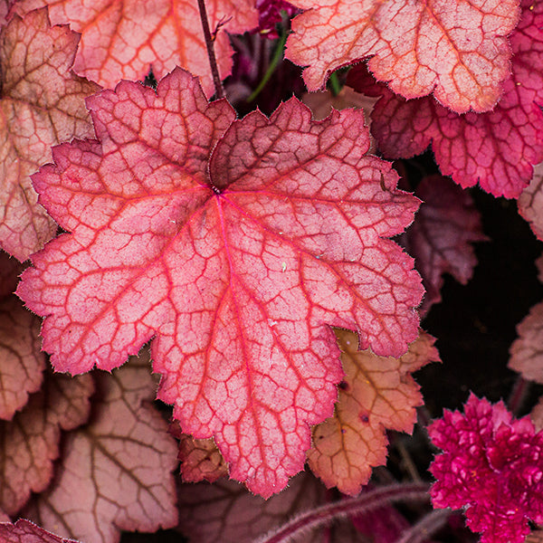 礬根 (學名:Heuchera spp.),又名「珊瑚鐘」或「鐘鈴花」。它最大的魅力在於那如絲絨般質感的葉片,以及隨季節、氣溫變化而呈現出的萬千色澤。不同於一般植物只有綠色,礬根擁有紅、黃、紫、黑、銀等多種色系,葉脈紋理清晰,層次感極強。