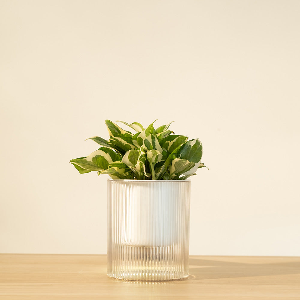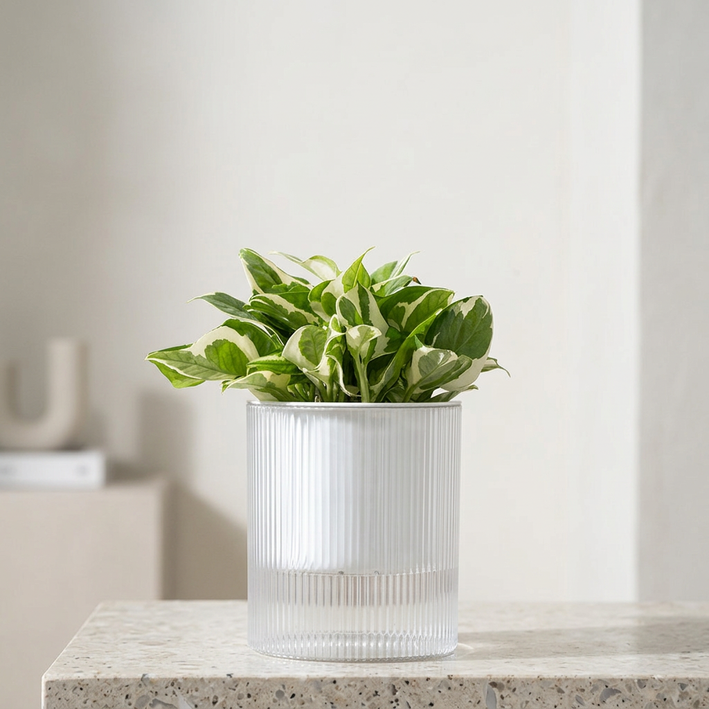這盆白金葛擁有如大理石般優雅的白綠斑紋,葉片小巧玲瓏且帶著微微的波浪摺邊,像是被精心潑灑了白漆藝術。它能為室內營造出一種純淨、亮麗且具現代感的清新氛圍。由於它非常耐陰且適應力強,非常適合擺放在光線稍弱的浴室、書桌或廚房層架上。養一盆白金葛不僅能讓視覺降溫,還能讓空間質感瞬間提升,是忙碌現代人最完美的「綠色懶人夥伴」。