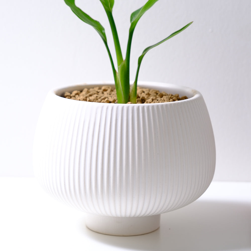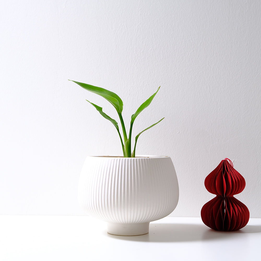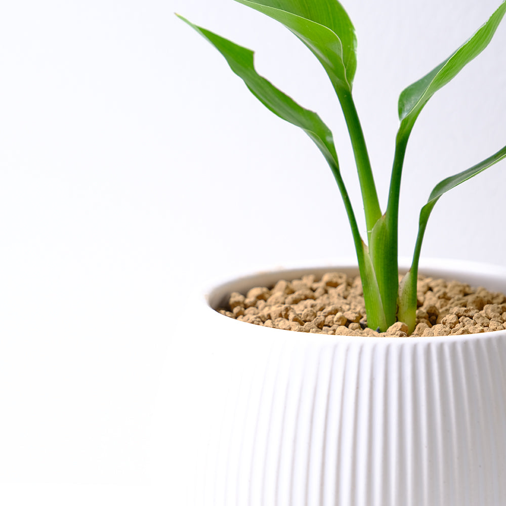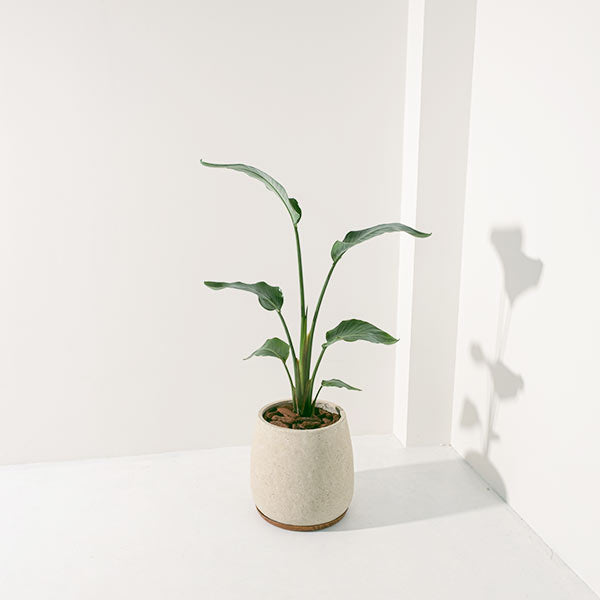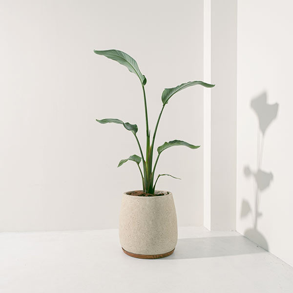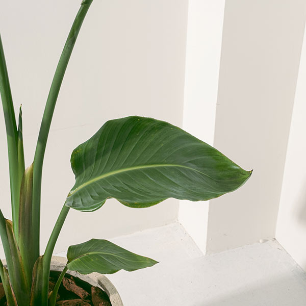 白花天堂鳥 (Strelitzia Nicolai) 源自非洲沿海,這款植物鍾愛充足的自然光線與溫暖宜人的環境。它擁有大氣的葉片與挺拔的姿態,是空間中最具視覺張力的裝飾。在經過約5至6年的耐心生長後,它將會開出巨大而令人驚嘆的白色花朵,如展翅高飛的鳥兒,為您的空間帶來一份壯麗與異域風情。若置於室內,白花天堂鳥的生長速度會較為緩慢,且開花頻率降低,此時可作為優雅的觀葉植物,為居家增添綠意。